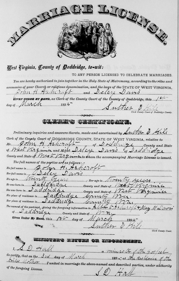 Wife: Delcy Davis Married: Mar- 3-1895 in Doddridge Co, WV 9 Born: ca 1875 in Doddridge Co, WV 9 Resided: 1951 in Smithburg, Doddridge Co, WV 10 Census: 1880 in Grant District, Doddridge Co, WV Father: Don Manuel Davis (1838 - 1894) Mother: Mary M. Smith (1853 - 1933)