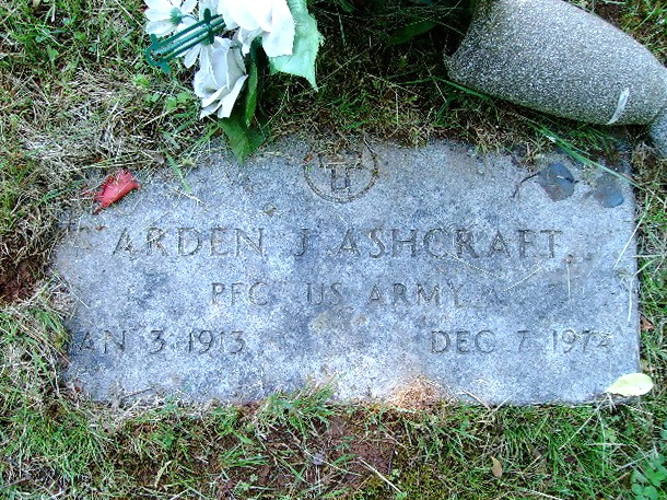 F Child 2: Delcy Ashcraft Census name: Delsie Ashcraft Born: Oct-27-1905 11 Died: Aug- -1978 11 Resided: in West Union, Doddridge Co, WV 11 Census: 1910, 1920, 1930 in Grant District, Doddridge Co, WV Husband: Samuel Franklin Griffin b. Apr-12-1902 d. Jan- -1979M Child 3: Arden John Ashcraft Born: Jan- 3-1913 at Harlin (Morgans Run), Doddridge Co, WV 1,13 Died: Dec- 7-1974 in Harrison Co, WV 15,13 Buried: in Archbold Cemetery, Smithburg, Doddridge Co, WV 5,15 Census: 1920, 1930 in Grant District, Doddridge Co, WV Military: Apr- 3-1942 - Nov-12-1945 Pfc, US Army, World War II 16