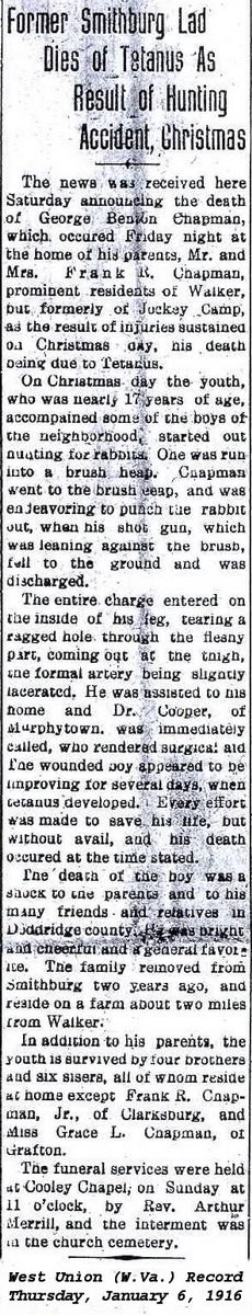 M Child 3: Samuel Ernest "Pug" Chapman Born: Aug- 2-1897 in West Union, Doddridge Co, WV 18,19,2 Died: Jul- -1965 in Ohio 19 Census: 1930 in Belpre, Washington Co, OH Resided: 1918 in Lumberport, Harrison Co, WV 14 Census: 1900, 1910 in West Union District, Doddridge Co, WV Occupation: 1930 laborer dismantling 16M Child 4: George Benton Chapman Born: Mar- -1899 2,3 Died: Dec-31-1915 at Walker, Wood Co, WV 20,3 Buried: in Cooley Chapel Cemetery, Walker, Wood Co, WV 20,6 Cause of death: tetanus Census: 1900, 1910 in West Union District, Doddridge Co, WV