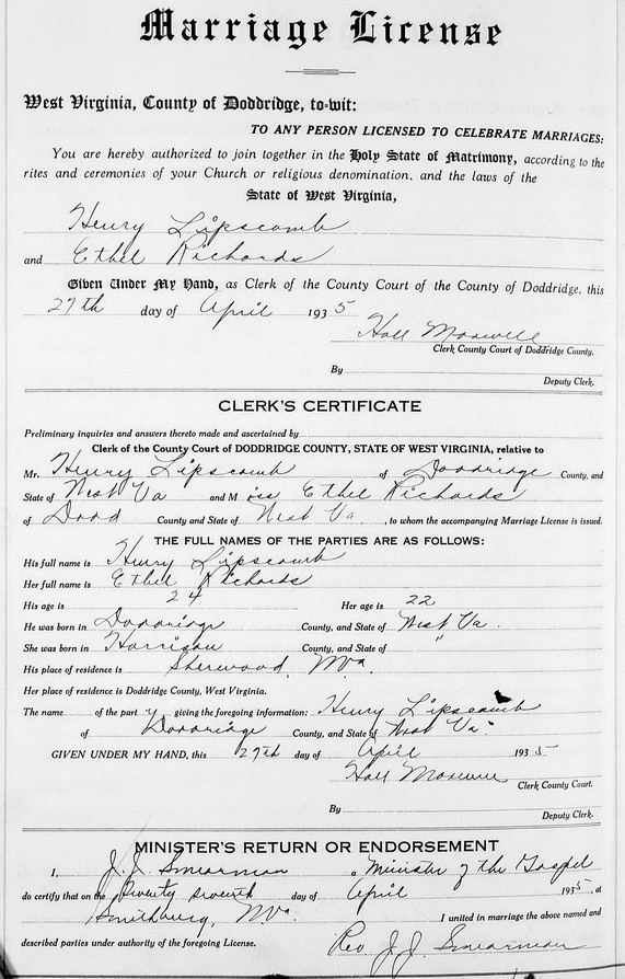 Wife: Ethel Bell Richards Married: Apr-27-1935 in Smithburg, Doddridge Co, WV 3