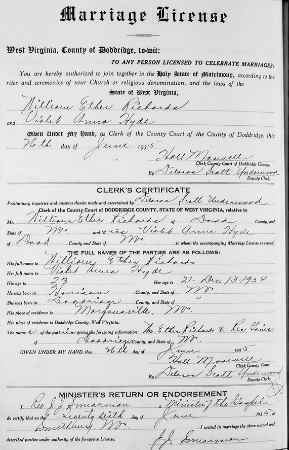Wife: Violet Anna Hyde Also known as: Anna Hyde 4,6 Married: Jun-26-1935 in Smithburg, Doddridge Co, WV 5