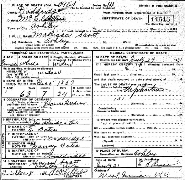 Wife: Malissa Bates Married: Sep-16-1896 in Tyler Co, WV 1 Born: Dec- 5-1867 in Doddridge Co, WV 3,1,4 Died: Jul-29-1931 at Ashley, Doddridge Co, WV 3 Buried: in Underwood Cemetery, near Ashley (Rt 23), Doddridge Co, WV 5,3 Census: 1900, 1920, 1930 in McClellan District, Doddridge Co, WV Resided: 1896, 1902 in Doddridge Co, WV 1 Census: 1870, 1880 in McClellan District, Doddridge Co, WV Father: Emanuel B. Bates (1838 - ) Mother: Nancy Ash (1837 - ) Other spouse 2