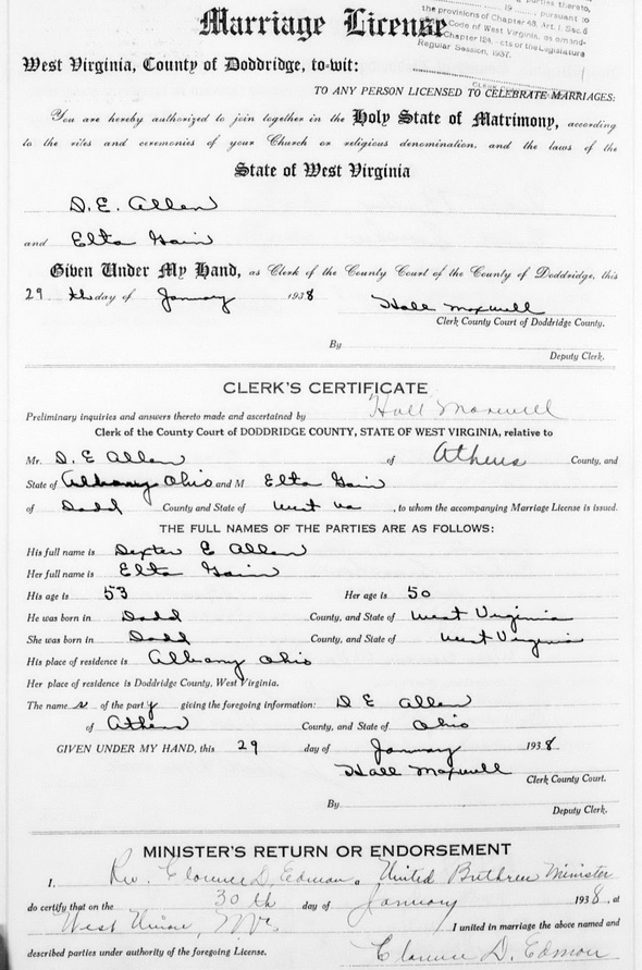 Sources: (1) 1900 Census, Doddridge County, WV (Grant District) (2) WV State Dept of Health, Div of Vital Statistics, Death Certificate (http://www.wvculture.org/vrr/va_dcsearch.aspx) (3) Headstone. (4) Doddridge County WV Marriages 1845-1937, Wes Cochran, 156 Gihon Meadows, Apt 150, Parkersburg, WV 26101 (Jan 1993) (5) Cemeteries of Tenmile District, Harrison County, WV, Harrison County Genealogical Society, Clarksburg, WV (1989, revised 1995) (6) 1910 Census, Doddridge County, WV (Grant District). (7) 1920 Census, Doddridge County, WV (West Union District). (8) Doddridge County Marriage Records, West Union, WV, MR Bk 7, p. 441. (9) Doddridge County Marriage Records, West Union, WV, Identified as Cleve Gain (age 21, b. in Doddridge) and Etta Hoskinson, age 20. MR Bk 7, p. 441. (10) Leola Williams Andrews, Jupiter, FL. (11) Doddridge County Death Records, West Union, WV, Identified as Elta (NMI) Allen, 74, widowed, b. Sep 12 1886 in Doddridge Co, dau of R. L. Hoskinson & Rebecca Vincent; died Dec 17 1960 in West Union, burial at IOOF Cemetery in Salem. Informant: Burlin Gain, Morgansville W.Va. (Note: Wes Cochran's "Doddridge County WV Deaths 1853-1969," p. 14, incorrectly reports death date as Dec 20 1960.), DR p. 4-A. (12) Doddridge County Death Records, West Union, WV. (13) Death record of husband. (14) Doddridge County Birth Records, West Union, WV, BR Bk 4, p. 65. (15) Social Security Death Index. (16) Obituary. (17) Social Security Death Index, Social Security card issued in Pennsylvania before 1951. (18) National Cemetery Administration. Nationwide Gravesite Locator, U.S. Veterans Gravesites (www.ancestry.com) (19) Obituary of husband. (20) Headstone (year only) (21) West Union WV Cemeteries (Doddridge County), Wes Cochran, 2515 10th Ave, Parkersburg, WV 26101 (July 1990) (22) Social Security Death Index, Social Security card issued in West Virginia before 1951. Name Index