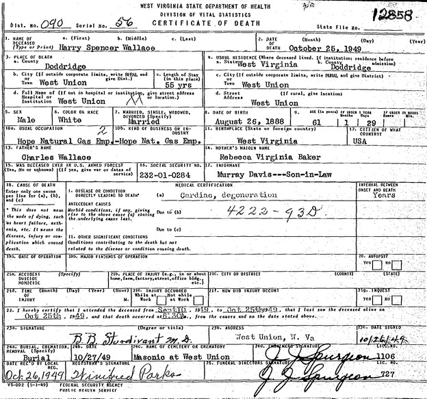 Jul-28-2018Husband: Harry Spencer Wallace Born: Aug-26-1888 in Marshall Co, WV 1,2,3,4 Died: Oct-25-1949 in Doddridge Co, WV 5,4 Buried: in Masonic Memorial Park Cemetery, Crystal Lake (West Union), WV 6,1 Resided: in West Union, Doddridge Co, WV 1 Census: 1930 in West Union District, Doddridge Co, WV Census: 1900, 1910 in McClellan District, Doddridge Co, WV Occupation: Hope Gas Co. 1 Father: Charles M. Wallace (1855 - 1937) Mother: Rebecca Virginia Baker (1858 - 1926)