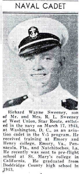 Jul-28-2018Husband: Richard Wayne Sweeney Also known as: Wayne Sweeney 1 Born: Mar-18-1925 in McClellan District, Doddridge Co, WV 2,3,4,5 Died: Aug-17-1997 at Lehigh Acres, Lee Co, FL 6,7,5 (see note 1) Buried: in Masonic Memorial Park Cemetery, Crystal Lake (West Union), WV 8 Resided: in Lehigh Acres, Lee Co, FL 9,8 Resided: 1947 in Charleston, Kanawha Co, WV 10 Resided: 1945 in Ashley, Doddridge Co, WV 4 Census: 1930, 1940 in McClellan District, Doddridge Co, WV Education: Doddridge Co HS (1943) 11 Military: Jun-15-1943 - Jan- 9-1946 U.S. Navy aviation, World War II, Korean War 8,11,5 Father: Richard Lee Sweeney (1887 - 1980) Mother: Vena Estella Hill (1895 - 1965)