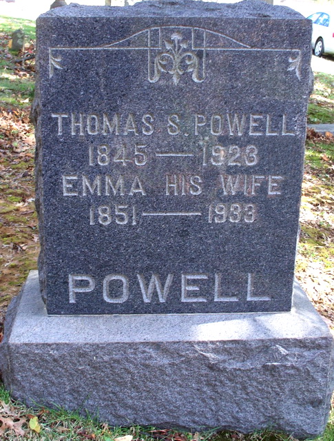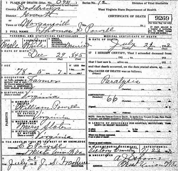 Sources: (1) WV State Dept of Health, Div of Vital Statistics, Death Certificate (http://www.wvculture.org/vrr/va_dcsearch.aspx) (2) Headstone (year only) (3) Doddridge County Marriage Records, West Union, WV. (4) Obituary - At home. (5) Donald Edward Ramage, Doddridge County Cemeteries, Vol. I, 4117 Almaville Rd, Smyna TN 37167 (1988, rev. 1999) (6) Findagrave.com. (7) 1920 Census, Ritchie County, WV (Clay District) (8) 1910 Census, Doddridge County, WV (Grant District). (9) 1880 Census, Doddridge County, WV (Central District) (10) 1890 Veterans Schedules [database online], Ancestry.com and National Archives & Records Administration. (11) U.S. Civil War Pension Index: General Index to Pension Files, 1861-1934 [database on-line], Ancestry.com and National Archives & Records Administration. (12) U.S. Civil War Soldiers, 1861-1865 [database online], National Park Service , Ancestry.com. (13) U.S. Civil War Soldier Records and Profiles [database on-line], Ancestry.com. (14) Obituary. (15) Headstone. (16) Obituary of husband. (17) West Virginia Births Index, 1853-1969 [database on-line], Ancestry.com. (18) West Virginia Deaths Index, 1853-1973 [database on-line], Ancestry.com. (19) Obituary of father. (20) West Virginia Marriages Index, 1785-1971 [database on-line], Ancestry.com. (21) 1930 Census, Doddridge County, WV (Grant District). (22) Death record of wife. (23) 1900 Census, Doddridge County, WV (Grant District) (24) 1920 Census, Doddridge County, WV (Central District). (25) 1940 Census, Doddridge County, WV (West Union District) (26) 1930 Census, Doddridge County, WV (West Union District). (27) Obituary of wife. (28) Obituary of brother. Event Notes Note (1) Birth date given in 1900 Census as May 1845, but obituary and death record state Dec 29 1845. But age 11 in the 1860 Census puts his birth in about 1849. Although his obituary and death record give his birthplace as Virginia, his marriage record states Greene County, Pennsylvania. At the time of his birth, the border separating Greene Co, Pa, and Monongalia Co, (W)Va, was not well-defined. Note (2) Although his obituary and death record state that he was buried at the Victory (Baptist) Cemetery, his marker is actually found at a nearby cemetery, the Wolverton Cemetery. According to "Doddridge County Cemeteries," Vol I, p. 123, the Wolverton Cemetery "was started after the small cemetery beside the Victory Baptist Church was filled. Sometimes referred to as the new Victory Baptist Church Cemetery in the West Union Record. Also referred to as the Powell or Victory Cemetery in the WPA 1933 reading." Note (3) The state-issued Civil War medal intended for Thomas S. Powell was never claimed and remains in storage at the West Virginia State Archives in Charleston. Note (4) In household of son Charles and his family. Note (5) Birth date given in 1900 Census as Feb 1882, but date on headstone is 1881. Note (6) Birth date given in 1900 Census as Sep 1882. But age in other censuses and in marriage record put it in about 1884 or 1885, while date on headstone is 1883. Note (7) Birth date given in 1900 Census as Nov 1886.