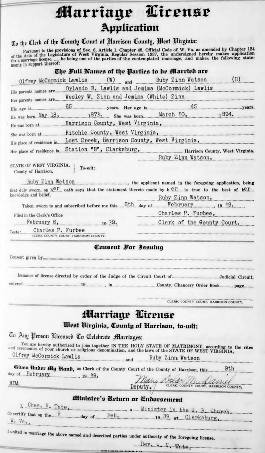 Jul-28-2018Husband: Olfrey McCormick Lawlis Born: May-18-1873 in Monongalia Co, WV 1,2,3,4 (see note 1) Died: Jan-28-1955 in Lost Creek, Harrison Co, WV 5 Buried: in IOOF Cemetery, Harrisville, Ritchie Co, WV 6,5 Resided: 1939 in Lost Creek, Harrison Co, WV 7 Census: 1930 in Grant District, Harrison Co, WV Resided: 1929 in Lost Creek, Harrison Co, WV 8 Census: 1900 in Otter District, Braxton Co, WV Resided: 1899 in Doddridge Co, WV Census: 1880 in New Milton District, Doddridge Co, WV Occupation: WV State worker (retired) 5 Occupation: farmer 2 Father: Orlando Bruce Lawlis (1842 - 1929) Mother: Jemima McCormick (1840 - 1911) Other spouse 2