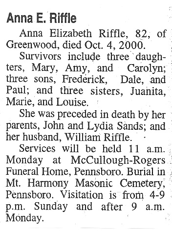 Born: ca 1908 in Braxton Co, WV 1 Died: bef Oct 1969 2 Resided: 1941 in Gem, Braxton Co, WV 1 Father: Loyd Riffle Mother: Alice ___Wife: Anna Elizabeth Sands 2 Married: Aug-28-1941 in Burnsville, Braxton Co, WV 1 Born: Jan-25-1918 in Braxton Co, WV 3,1 Died: Oct- 4-2000 3 Buried: in Mt. Harmony Masonic Cemetery, Pennsboro, Ritchie Co, WV 4 Resided: at Greenwood, Doddridge Co, WV 5 Resided: 1941 in Gem, Braxton Co, WV 1 Father: John Earnest Sands (1881 - 1952) Mother: Lydia Frances Wilson (1886 - 1955)