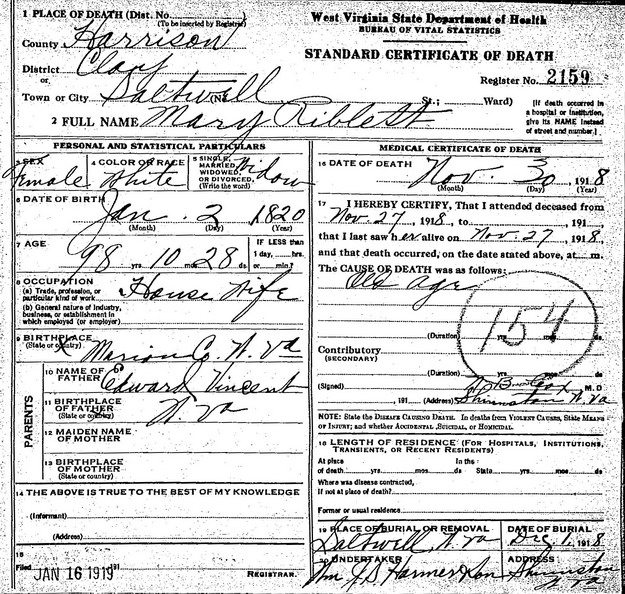 Father: Mother:Wife: Mary Vincent Married: Oct- -1844 in Marion Co, (W)VA 1 Born: Jan- 2-1820 in Marion Co, (W)VA 2 Died: Nov-30-1918 at Saltwell, Harrison Co, WV 2 Father: Edward T. Vincent (1783 - 1868) Mother: Rebecca Wisby (1793 - 1875)