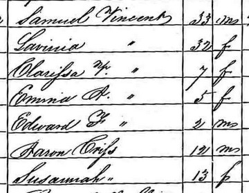 F Child 2: Clarissa V. Vincent Born: ca 1853 in Marion Co, (W)VA 4,6 Census: 1860 in Boothsville, Marion Co, WV 3 Husband: James T. Hawkins b. ca 1845 Married: Jun-11-1876 in Marion Co, WV 4