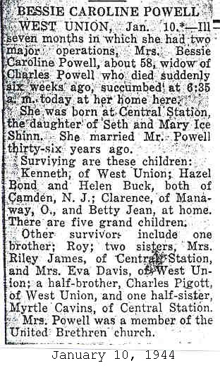 Wife: Bessie Caroline Shinn Married: ca 1907 10 Born: Dec-31-1887 at Central Station, Doddridge Co, WV 5,6 (see note 2) Died: Jan-10-1944 in West Union, Doddridge Co, WV 5,6 Buried: in Masonic Memorial Park Cemetery, Crystal Lake (West Union), WV 5 Cause of death: cancer of liver & gall bladder 5 Census: 1940 at Doe Run (West Union), Doddridge Co, WV 7 Census: 1930 in West Union District, Doddridge Co, WV Census: 1920 in Central District, Doddridge Co, WV Census: 1910 in Grant District, Doddridge Co, WV Census: 1900 in Central District, Doddridge Co, WV Father: Seth Anias Shinn (1853 - 1937) Mother: Mary Sidney Ice (1848 - 1921)
