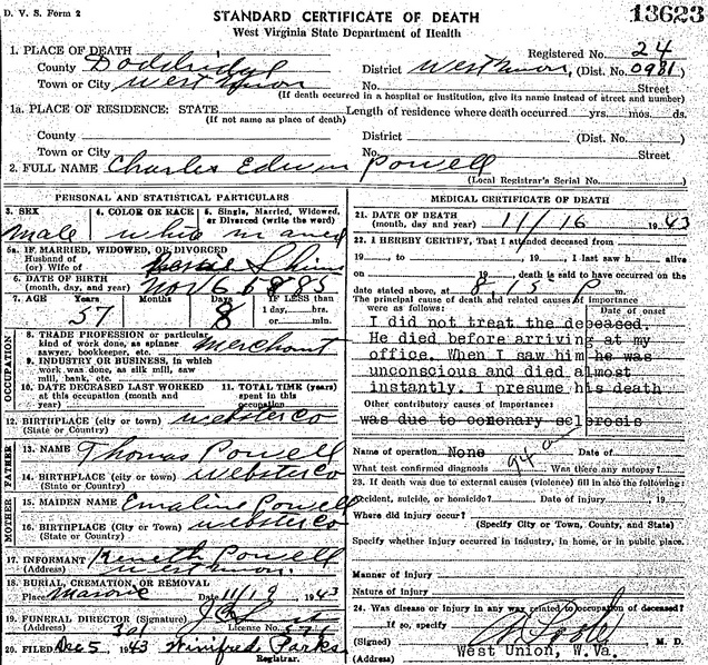 Jul-28-2018Husband: Charles Edwin Powell Also known as: Charley Powell 1,2,3,4 Born: Nov- 6-1885 in Webster Co, WV 5 (see note 1) Died: Nov-16-1943 in West Union, Doddridge Co, WV 5 Buried: in Masonic Memorial Park Cemetery, Crystal Lake (West Union), WV 5,6 Census: 1940 at Doe Run (West Union), Doddridge Co, WV 7 Census: 1930 in West Union District, Doddridge Co, WV Resided: 1923 in West Union, Doddridge Co, WV 8 Census: 1920 in Central District, Doddridge Co, WV Census: 1900, 1910 in Grant District, Doddridge Co, WV Occupation: merchant, gas station operator 6,5 Occupation: 1930 teamster (own teams) 9 Occupation: farmer 7,4 Father: Thomas S. Powell (1845 - 1923) Mother: Emaline Powell (1851 - 1933)