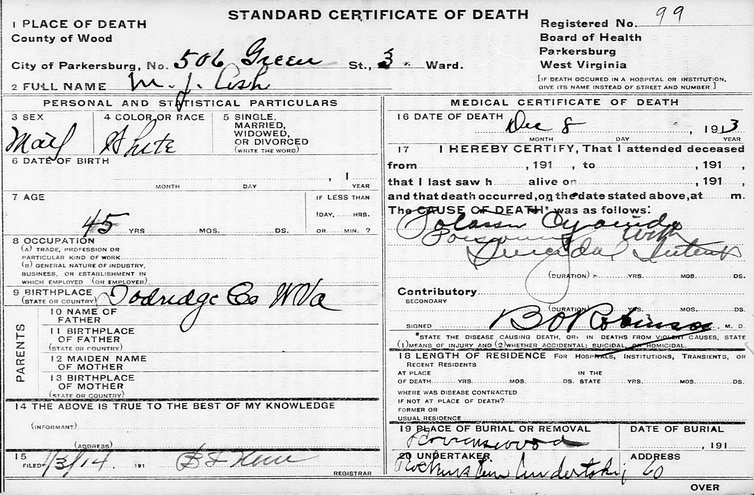 Jul-28-2018Husband: Marion J. Ash Born: Jul- 7-1865 in Doddridge Co, WV 1,2 Died: Dec- 8-1913 in Parkersburg, Wood Co, WV 2 Buried: in Ravenswood Cemetery, Jackson Co, WV 2,3 Cause of death: "potassium cyanicide with suicidal intent" 2 Census: 1870, 1880 in McClellan District, Doddridge Co, WV Father: Peter A. Ash (1836 - 1909) Mother: Rheulanah Bonnell (1843 - )
