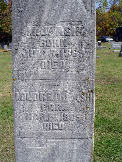 Sources: (1) West Virginia Births Index, 1853-1969 [database on-line], Ancestry.com. (2) Wood County Death Records, Parkersburg, WV. (3) Findagrave.com. (4) Harrison County Death Records, Clarksburg, WV, Identified as Marion J. Ash, 21, farmer, b. Ohio, res. Doddridge Co, son of Peter A. & Rulanah Ash; and Mildred J. Exline, 21, b. Marion Co, res. Harrison Co, dau of George & Elizabeth Exline. Married Oct 14 1886 in Harrison County. (Note: Husband's birthplace is given as Doddridge County in both his birth and death records. He is identifed in his birth record as Marion Ash, and in his death record as M. J. Ash.), MR p. 188 : www.wvculture.org/vrr/va_view.aspx?Id=256434&Type=Marriage. (5) Headstone. (6) 1900 Census, Jackson County, WV. (7) Harrison County Marriage Records, Clarksburg, WV.Name Index