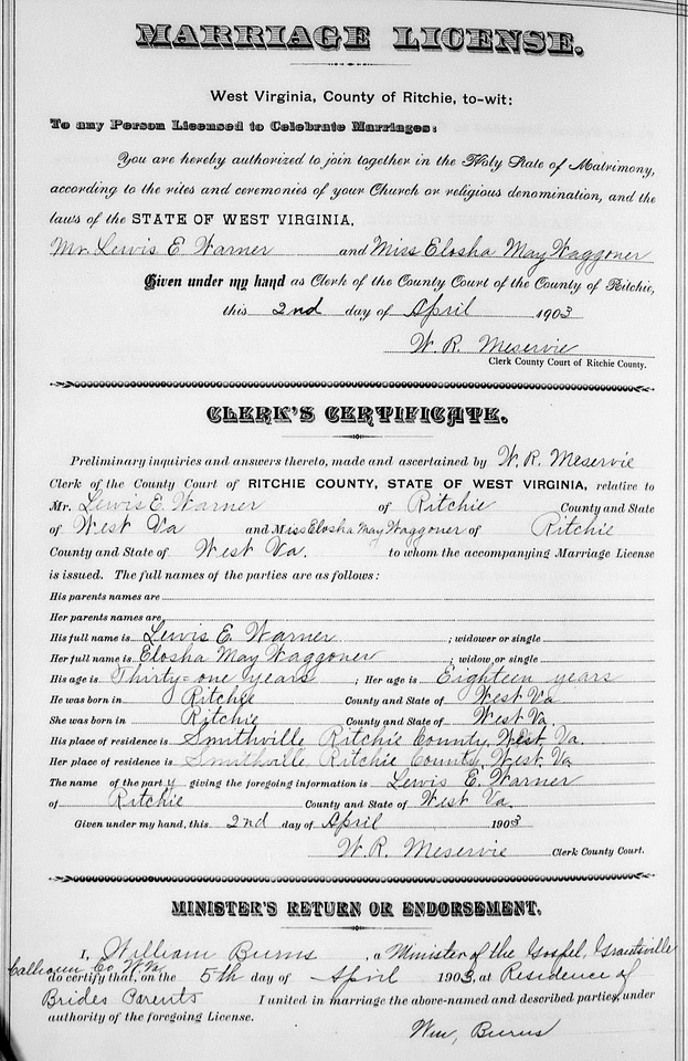Wife: Elosia May Waggoner 5 Also known as: May Wagoner 6 Married: Apr- 5-1903 in Ritchie Co, WV 7 Born: ca 1884 8 Census: 1920, 1930 in Union District, Ritchie Co, WV Father: Mother: