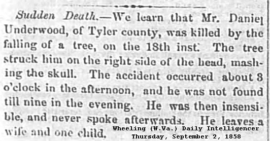 Jul-28-2018Husband: Daniel Underwood Born: Feb- 2-1830 in Tyler Co, (W)VA 1,2,3 Died: Aug-18-1858 in Tyler Co, (W)VA 4 (see note 1) Cause of death: struck by falling tree 4 Census: 1856 in Danville, Des Moines Co, IA Resided: 1854 in Doddridge Co, (W)VA 3 Census: 1850 in Tyler Co, (W)VA Father: Samuel Underwood (1791 - 1865) Mother: Margaret George (1803 - 1871) Other spouse 1