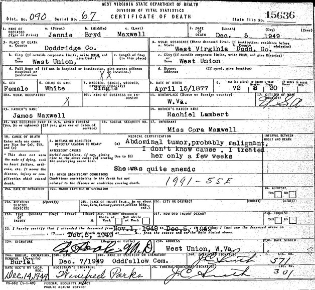 F Child 1: Olive Maude Maxwell Born: Oct-11-1874 in West Virginia 15,16 Died: Aug- 2-1950 in West Union, Doddridge Co, WV 15 Buried: (Maxwell mausoleum) in Blockhouse Hill Cemetery (IOOF section), West Union, Doddridge Co, WV 7,15 (see note 1) Resided: in West Union, Doddridge Co, WV 15,17,18 Census: 1940 at Jockey Camp, Doddridge Co, WV 19 Census: 1880, 1900 in New Milton District, Doddridge Co, WV Husband: Creed Collins Heflin b. Jan-13-1874 d. May-15-1961 Married: Dec- 1-1904 in Doddridge Co, WV 16F Child 2: Jennie Byrd Maxwell Census name: Byrd Maxwell 20 Born: Apr-15-1877 21 Died: Dec- 5-1949 in West Union, Doddridge Co, WV 14,15 Buried: (Maxwell mausoleum) in Blockhouse Hill Cemetery (IOOF section), West Union, Doddridge Co, WV 7,15 Resided: in West Union, Doddridge Co, WV 15 Census: 1910, 1920, 1930 in West Union District, Doddridge Co, WV Census: 1880, 1900 in New Milton District, Doddridge Co, WV Never married: 15
