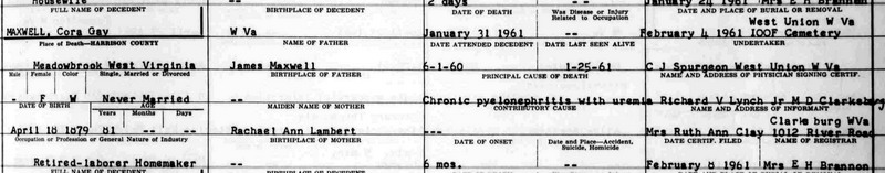 F Child 3: Cora Gay Maxwell Born: Apr-18-1879 22 (see note 2) Died: Jan-31-1961 in Meadowbrook, Harrison Co, WV 23 Buried: (Maxwell mausoleum) in Blockhouse Hill Cemetery (IOOF section), West Union, Doddridge Co, WV 7,23 Census: 1910, 1920, 1930 in West Union District, Doddridge Co, WV Census: 1880, 1900 in New Milton District, Doddridge Co, WV Education: West Virginia Wesleyan 8 Never married: 23