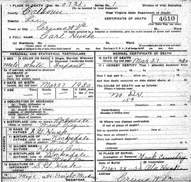 F Child 3: Manlee (twin) Husk Born: Oct-30-1931 Died: Oct-30-1931 Buried: in Samuel A. Husk Family Cemetery, Calhoun Co, WV 5