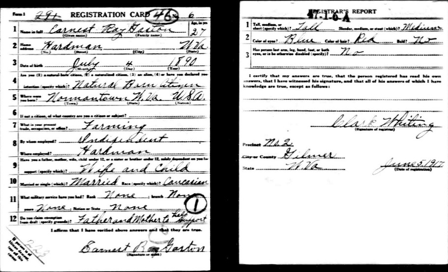 M Child 2: Harold Dean "Toots" Gaston Born: Jan-31-1918 in Hardman, Gilmer Co, WV 4 Died: Feb- 4-1997 in Glenville, Gilmer Co, WV 6 Buried: in Meadows Cemetery, Normantown, Gilmer Co, WV 4 Resided: in Normantown, Gilmer Co, WV 9 Census: 1930 in Center District, Gilmer Co, WV Occupation: carpenter, electrician, farmer 4 Military: Pfc, U.S. Army, World War II 11 Wife: Pearl Turner b. Aug-11-1922 Married: May-27-1945