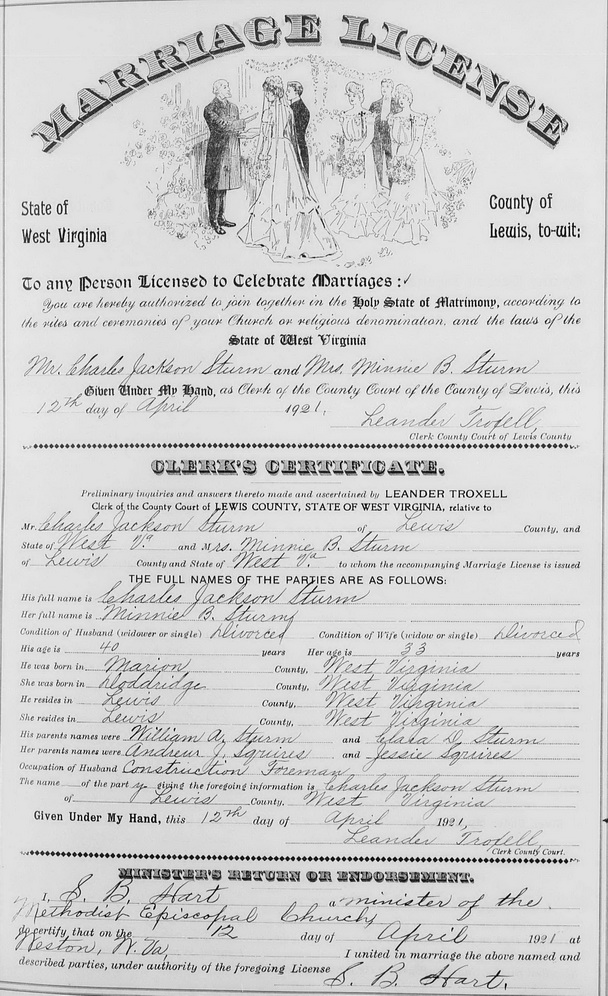 Jul-28-2018Husband: Charles Jackson Sturm Also known as: Charlie J. Sturm 1 Born: Jan- 4-1881 in Mannington, Marion Co, WV 2,3,1 Died: Aug-27-1949 in Parkersburg, Wood Co, WV 2 Buried: in Rockland Cemetery, Belpre, Washington Co, OH 2,4 Resided: in Belpre, Washington Co, OH 2 Census: 1940 in Rockland, Washington Co, OH Resided: 1935 in Doddridge Co, WV 5 Census: 1930 in Greenwood, Doddridge Co, WV 6 Resided: 1925 in Doddridge Co, WV 7 Resided: 1921 in Lewis Co, WV 8 Census: 1920 in Weston, Lewis Co, WV Census: 1910 in Clay District, Monongalia Co, WV Resided: 1904 in Marion Co, WV 1 Occupation: Eureka Pipe Line Co. 2 Occupation: 1940 service station operator 5 Occupation: 1930 pipeline connection foreman 6 Occupation: 1921 construction foreman 8 Occupation: 1920 lineman for gas company 9 Occupation: 1910 oil station manager 10 Father: William Sturm (1857 - ) Mother: Clara D. Boggess (1859 - ) Other spouse 1