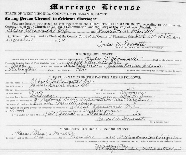 Jul-28-2018Husband: Albert Ellsworth Dye Born: ca 1918 in Park Co, WY 1 Resided: 1962 in Williamstown, Wood Co, WV 1 Father: Mother: