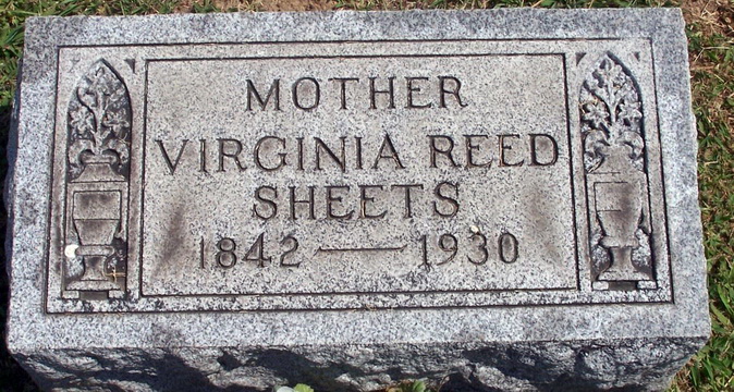 Born: Feb-25-1827 1,2 Died: Feb-25-1892 in Pennsboro, Ritchie Co, WV 1 Census: 1880 in Clay District, Ritchie Co, WV Resided: 1866 in Marion Co, WV 2 Occupation: farmer 3 Father: Robert Reed (1802 - 1855) Mother: Sarah Ann Winter (1804 - 1831)Wife: Hannah Virginia "Jennie" Johnston Census name: Virginia Johnston Married: Oct- 9-1866 in Doddridge Co, WV 4 Born: Oct-19-1842 in Frederick Co, VA 5,2,6 Died: May-24-1930 in Wood Co, WV 7 Buried: in Riverview (aka K of P) Cemetery, Williamstown, Wood Co, WV 5 Census: 1910 in Washington District, Pleasants Co, WV Resided: 1906 in Ellenboro, Ritchie Co, WV 8 Census: 1880 in Clay District, Ritchie Co, WV Resided: 1866 in Doddridge Co, WV 2 Census: 1850, 1860 in Doddridge Co, (W)VA Father: Addison A. Johnston (1811 - 1855) Mother: Mary Elizabeth Rust (1818 - 1892) Other spouse 2
