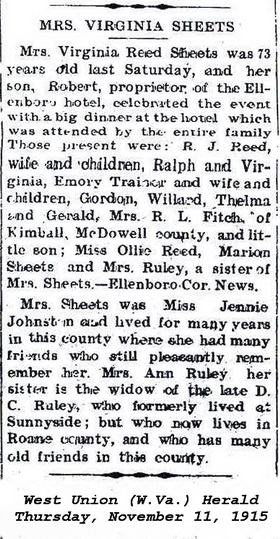 M Child 1: Robert Johnston Reed Born: Aug-16-1868 in Marion Co, WV 1 Died: Sep-28-1931 in Wood Co, WV 1 Buried: in Riverview (aka K of P) Cemetery, Williamstown, Wood Co, WV 5 Census: 1880 in Clay District, Ritchie Co, WV Occupation: 1915 proprietor of Ellenboro Hotel 9