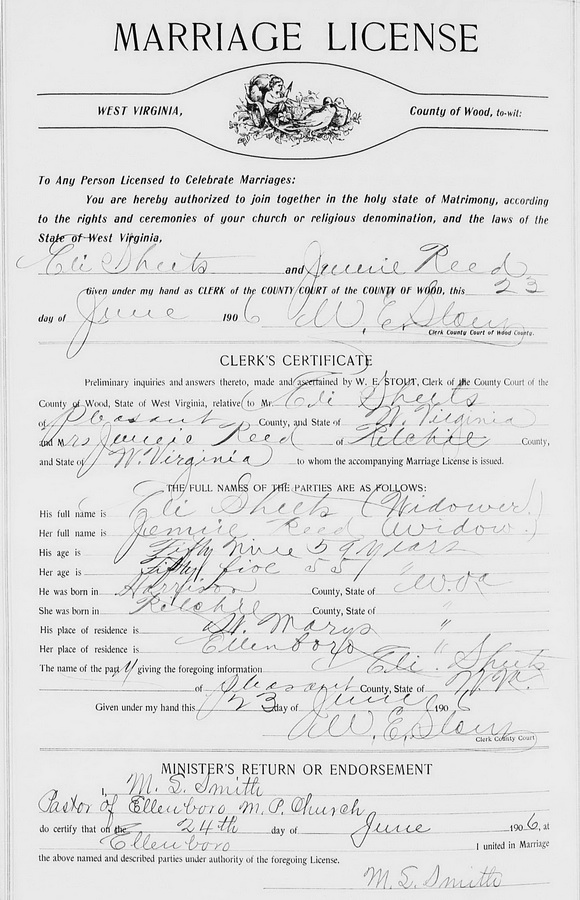 Sources: (1) Findagrave.com. (2) 1870 Census, Doddridge County, WV (New Milton Twp). (3) Wood County Marriage Records, Parkersburg, WV. (4) West Virginia Deaths Index, 1853-1973 [database on-line], Ancestry.com. (5) Doddridge County Republican, 9/10/1914. (6) 1900 Census, Harrison County, WV. (7) Doddridge County Republican, 9/17/1914. (8) Wood County Marriage Records, Parkersburg, WV, Identified as Eli Sheets, widowed, 59, b. Harrison Co, res. St. Marys; and Jennie Reed, widowed, 55, b. Ritchie Co, res. Ellenboro. Married Jun 24 1906 at Ellenboro, officiated by M. S. Smith, Pastor of Ellenboro M. P. Church. Informant for marriage license: Eli Sheets. (NOTE: Wife's birthplace is incorrect, based on her previous marriage record and the known birthplaces of her two adjacent siblings, all of which show a birthplace of Frederick County, Virginia.), MR p. 164 : www.wvculture.org/vrr/va_view.aspx?Id=10247030&Type=Marriage. (9) Doddridge County Marriage Records, West Union, WV. (10) 1860 Census, Doddridge County, (W)VA. Event Notes Note (1) Birthdate given as Jan 1848 in 1900 Census.Name Index