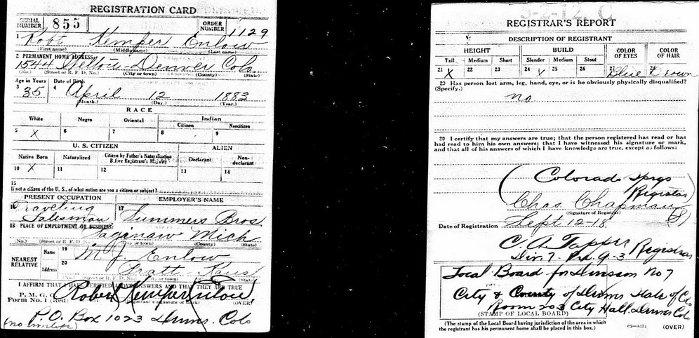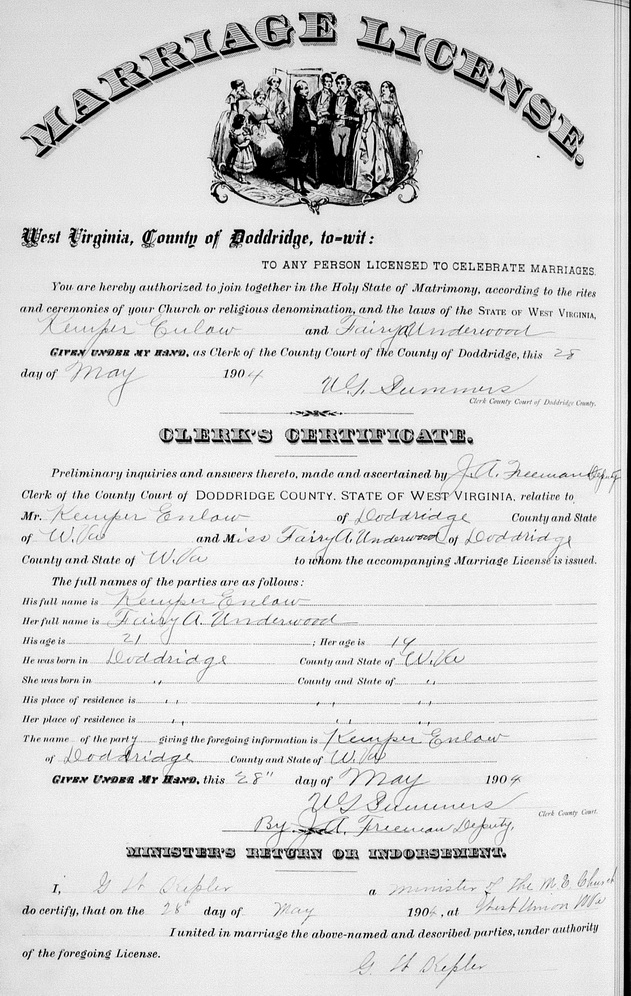 Sources: (1) Doddridge County Marriage Records, West Union, WV. (2) West Virginia Births Index, 1853-1969 [database on-line], Ancestry.com. (3) National Archives and Records Administration, World War I Draft Registration Cards, 1917-1918 (Ancestry.com online database) (4) Texas Death Index, 1903-2000 [database on-line], Ancestry.com and Texas Dept of Health, Vital Statistics Unit. (5) Findagrave.com. (6) National Archives and Records Administration, World War II Draft Registration Cards, 1942 (Ancestry.com online database) (7) Obituary of sister. (8) City Directory. (9) West Union Herald, 11/14/1912. (10) Obituary of mother. (11) 1930 Census. (12) Birth record of son. (13) 1900 Census, Wood County, WV. (14) Doddridge County Marriage Records, West Union, WV, Identified as Kemper Enlow, 21, b. & res. in Doddridge Co; and Fairy O. (or A.) Underwood, 19, b. & res. in Doddridge Co. Married May 28 1904 in West Union, officiated by G. W. Kepler, a Minister of the M. E. Church. MR p. 174 : www.wvculture.org/vrr/va_view.aspx?Id=11794314&Type=Marriage. (15) Social Security Applications and Claims Index, 1936-2007 [database on-line], Ancestry.com. (16) 1900 Census, Doddridge County, WV (McClellan District) (17) Ohio Deaths, 1908-1932, 1938-1944, and 1958-2007 (online), Ancestry.com and Ohio Department of Health. (18) 1920 Census. (19) Headstone. (20) Doddridge County Birth Records, West Union, WV, BR p. 66 : www.wvculture.org/vrr/va_view.aspx?Id=2616603&Type=Birth. (21) Social Security Death Index. (22) Oregon Death Index, 1898-2008 [database on-line], Ancestry.com. (23) Social Security Death Index, Social Security card issued in Ohio before 1951. (24) 1940 Census. Event Notes Note (1) His birth date is given as Apr 12 1883 in his birth record and in his World War One draft registration, and the 1900 Census shows him as age 17, born in Apr 1883. This also conforms to his age 21 and 28 in his 1904 and 1911 marriage records. But all subsequent records, including his World War II draft registration, Social Security records, and the date on his grave marker, show him exactly ten years younger, with birth date Apr 12 1893. Note (2) Listed as a lodger at a hotel, he was identified as Kemper Enlow, 17, b. Apr 1883, occupation bell boy. Note (3) In household of maternal grandparents, Isaac N. & Mattie Underwood.Name Index