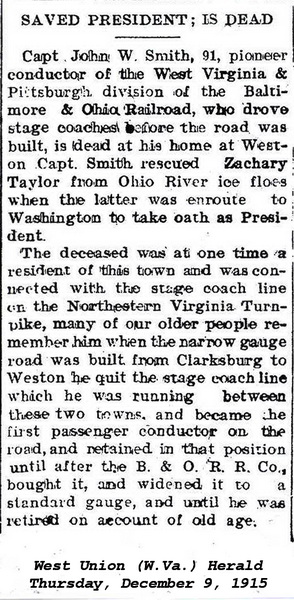 Jul-28-2018Husband: John Walter Smith Born: Oct- -1833 in Fauquier Co, VA 1,2,3,4 Died: Dec- 1-1915 in Weston, Lewis Co, WV 5 Buried: in Lost Creek 7th Day Baptist (Brick Church) Cemetery, Harrison Co, WV Resided: from abt 1910 in Weston, Lewis Co, WV 6 Resided: formerly in Lost Creek, Harrison Co, WV 6 Census: 1900, 1910 in Grant District, Harrison Co, WV Census: 1870 in Clark District, Harrison Co, WV Resided: 1866 in Harrison Co, WV Census: 1850, 1860 in Harrison Co, (W)VA Occupation: stage coach driver, railroad conductor 7,8,1 Father: Thomas Smith (1801 - ) Mother: Mary A. ___ (1812 - ) Notes