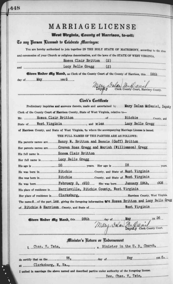 Wife: Lucy Belle Gregg 1 Married: May-26-1936 in Clarksburg, Harrison Co, WV 5