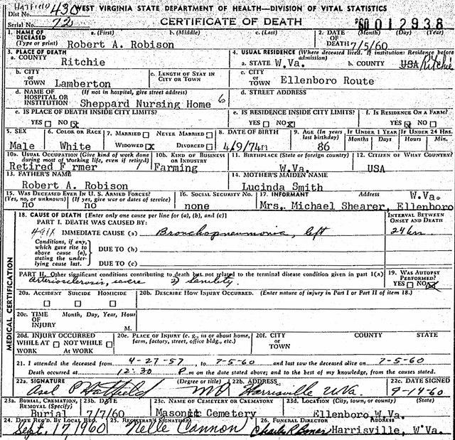 Jul-28-2018Husband: Robert A. Robison Also known as: Robert A. Robinson 1 Born: Apr- 9-1874 2,3 Died: Jul- 5-1960 in Lamberton (Ellenboro), Ritchie Co, WV 2,3 Buried: in Ellenboro Masonic Cemetery, Ritchie Co, WV 2,4 Resided: near Ellenboro, Ritchie Co, WV 2 Census: 1900 in West Union District, Doddridge Co, WV Occupation: farmer 2,5 Father: Robert Robinson (1836 - ) Mother: Lucinda Smith (1843 - )
