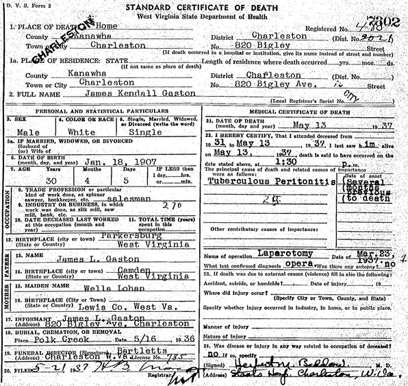 M Child 1: James Kendall Gaston Also known as: J. Kendall Gaston 5 Born: Jan-18-1907 in Parkersburg, Wood Co, WV 7,2 Died: May-13-1937 in Charleston, Kanawha Co, WV 9 (see note 2) Buried: in Waldeck Cemetery, Polk Creek, Lewis Co, WV 5 (see note 3) Resided: in Charleston, Kanawha Co, WV 7 Occupation: salesman 7 Never married: 7