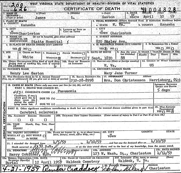 Jul-28-2018Husband: James Lloyd (Huston) Gaston Born: Sep- 7-1870 in Camden, Lewis Co, WV 1,2,3,4 (see note 1) Died: Apr-10-1959 in Charleston, Kanawha Co, WV 1,2 Buried: in Waldeck Cemetery, Polk Creek, Lewis Co, WV 5,1 Resided: in Charleston, Kanawha Co, WV 1 Occupation: salesman 1 Father: Henry Lee Gaston (1841 - 1923) Mother: Mary Jane Turner (1846 - 1936)