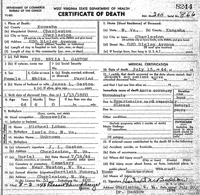 Sources: (1) WV State Dept of Health, Div of Vital Statistics, Death Certificate (http://www.wvculture.org/vrr/va_dcsearch.aspx) (2) Headstone (year only) (3) Harrison County WV Marriages 1895-1912, Wes Cochran, 2515 10th Ave, Parkersburg, WV 26101 (Feb 2001) (4) Death record of son. (5) Headstone. (6) Harrison County WV Marriages 1895-1912, Wes Cochran, 2515 10th Ave, Parkersburg, WV 26101 (Feb 2001), Identified as James Lloyd Gaston, 35, b. Lewis Co, res. Marion Co, son of Henry L. & Mary J.; and Wella Lohan, 26, b. Lewis Co, res. Harrison Co, dau of Michael (last name not stated), mother not identified. Married Jun 4 1906. (7) Kanawha County Death Records, Charleston, WV. (8) Kanawha County Death Records, Charleston, WV, Identified as Wella L. Gaston, father: Michael Lohan, mother: unknown. (9) Kanawha County Death Records, Charleston, WV, Identified as James Kendall Gaston, son of James L. Gaston & Wella Lohan, b. Jan 18 1907 in Parkersburg, died May 13 1937 in Charleston, age 30y 4m 5d. Cause of death: tuberculous peritonitis. Event Notes Note (1) But based on age reported in Lewis County Census, birthdate would be about Sep 7 1871. Note (2) Death date on headstone is 1936, but death record states May 13 1937. Note (3) death record gives burial location as Polk CreekName Index