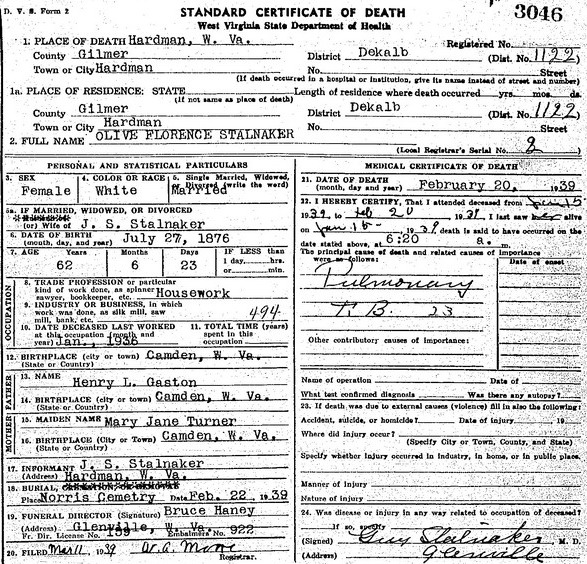 Wife: Olive Florence Gaston 2,1 Also known as: Florence Gaston 7 Married: Mar-11-1903 in Gilmer Co, WV 2 Born: Jul-27-1876 in Camden, Lewis Co, WV 1 Died: Feb-20-1939 in Hardman, Gilmer Co, WV 1 Buried: in Norris Cemetery, Gilmer Co, WV 1 Resided: in Hardman, Gilmer Co, WV 1 Census: 1910, 1920, 1930 in DeKalb District, Gilmer Co, WV Father: Henry Lee Gaston (1841 - 1923) Mother: Mary Jane Turner (1846 - 1936)