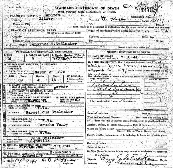 Jul-28-2018Husband: Jennings S. Stalnaker Born: Mar- 2-1872 1,2 Died: Jul-18-1941 in Hardman, Gilmer Co, WV 1 Buried: in Norris Cemetery, Gilmer Co, WV 1 Cause of death: prostate cancer 3 Census: 1910, 20, 30, 40 in DeKalb District, Gilmer Co, WV Occupation: farmer 1,4,5,6 Father: Marcellous Stalnaker ( - 1920) Mother: Jarusha Vannoy (1847 - 1938)