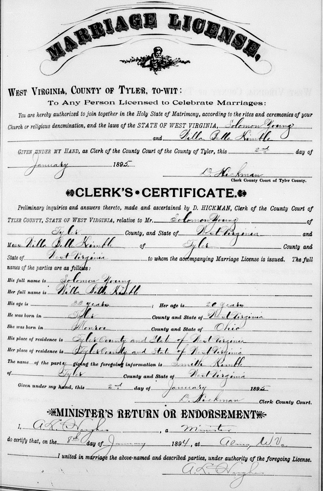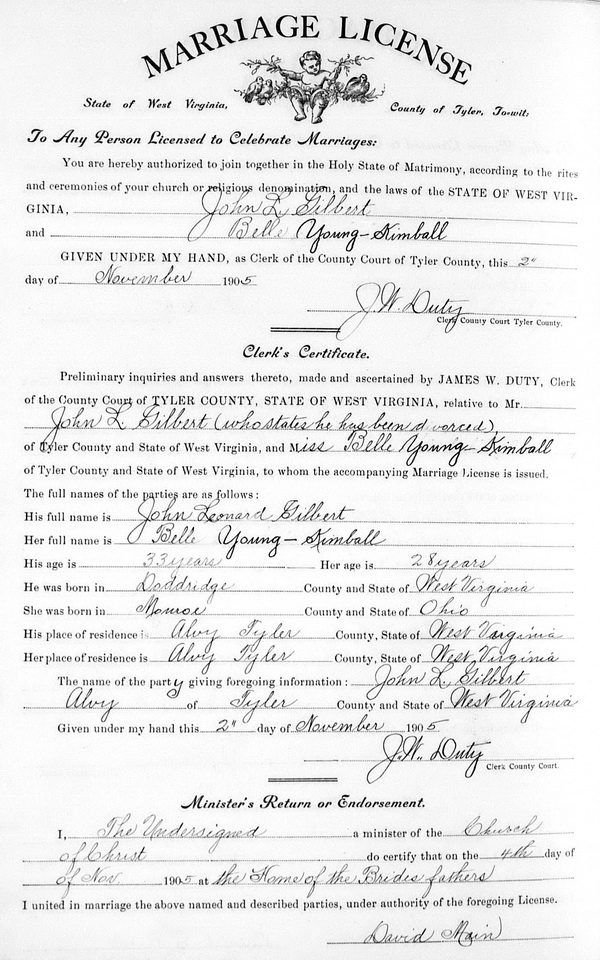 Wife: Willie Belle Kimball Census name: Belle Kimbal Married: Nov- 4-1905 in Tyler Co, WV 8 Born: Dec- -1877 in Monroe Co, OH 9,8 Census: 1940 in Rock Run (West Union), Doddridge Co, WV 5 Census: 1930 in Neds Run, Big Flint, Doddridge Co, WV 7 Census: 1920 in West Union District, Doddridge Co, WV Census: 1910 in McClellan District, Doddridge Co, WV Resided: 1905 in Alvy, Tyler Co, WV 10,8 Census: 1900 in McElroy District, Tyler Co, WV Resided: 1894 in Tyler Co, WV 8 Census: 1880 in Centerville District, Tyler Co, WV Father: Joseph L. Kimball (1836 - 1909) Mother: Catharine McCue (1840 - ) Other spouse 1 Notes