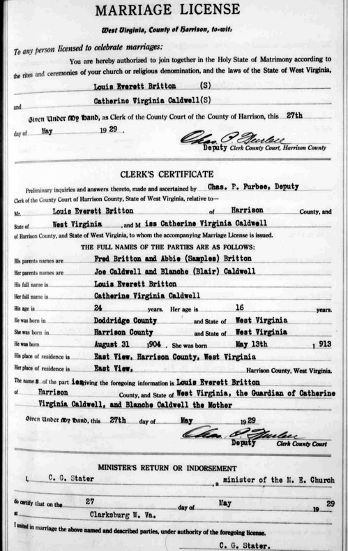 Wife: Catherine Virginia Caldwell 1,10 Married: May-27-1929 in Clarksburg, Harrison Co, WV 4