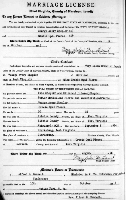 Wife: Gracie Opal Pierce 1 1 Also known as: Opal Pierce 2,4,5,6 Married: Oct-10-1935 in Nutter Fort, Harrison Co, WV 3 Divorced: Nov- -1946 in Washington Co, OH 7