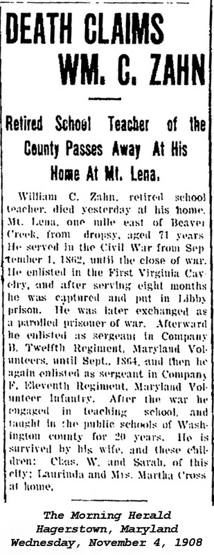 Sources: (1) Obituary - At home. (2) Findagrave.com. (3) Obituary. (4) Historical Military Records, www.fold3.com. (5) U.S. Civil War Soldier Records and Profiles [database on-line], Ancestry.com. (6) U.S. Civil War Soldiers, 1861-1865 [database online], National Park Service , Ancestry.com. (7) Obituary of husband. Event Notes Note (1) Military records show that William C. Zahn enlisted on 5 Sep 1861 in Clarksburg, Va. (age 23), and mustered in on 21 Sep 1861 in Clarksburg, Va., as a Private in Co F, 1st Reg. Va. Mtd. Cav. Vol. Descriive Book: 5’10", fair complexion, hazel eyes, sandy hair, born in Frederick County, Maryland, occupation farmer. He was captured by Ashby's Cavalry near Strasburg, Virginia, on 26 Mar 1862, confined at Richmond, Virginia (presumably at Libby Prison). He was paroled on 11 May 1862 and granted a discharge on 23 May 1862 in Washington, DC, by surgeon's certificate. Note (2) "He served in the Civil War from Sep 1, 1862, until the close of the war. He enlisted in the First Virginia Cavalry, and after serving eight months he was captured and put in Libby prison. He was later exchanged as a paroled prisoner of war. Afterward he enlisted as Sergeant in Company B, Twelfth Regiment, Maryland Volunteers, until Sept. 1864, and then he again enlisted as sergeant in Company F, Eleventh Regiment, Maryland Volunteer Infantry." [From his obituary. The stated 1862 enlistment date pertains to his Maryland service, not his West Virginia service, which records show began on Sep 5 1861.]
