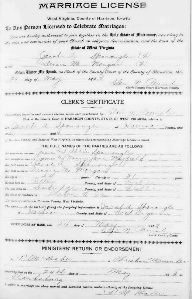 Jul-28-2018Husband: Jacob Asbury Sponaugle Also known as: J. A. Sponaugle 1 Born: 1859 in Pendleton Co, (W)VA 2,3 (see note 1) Died: Sep-18-1923 in Clarksburg, Harrison Co, WV 4 Buried: in IOOF Cemetery, Salem, Harrison Co, WV 5 Resided: 1913, 1923 in Salem, Harrison Co, WV 6,3 Census: 1910 in Salem, Harrison Co, WV Census: 1900 in West Union District, Doddridge Co, WV Census: 1870, 1880 in Pendleton Co, WV Census: 1860 in Pendleton Co, (W)VA Occupation: teamster 4 Occupation: 1910 farmer 7 Occupation: 1900 teamster 8 Father: Jesse Sponaugle (1825 - ) Mother: Abagale "Abbie" Strother (1835 - 1900) Other spouse 2