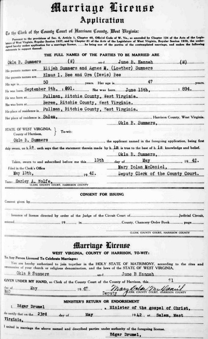 Jul-28-2018Husband: Okla Bernard Summers Born: Sep- 9-1891 in Pullman, Ritchie Co, WV 1,2,3 Died: Jan- -1966 4,3 Buried: in Pullman Cemetery, Pullman, Ritchie Co, WV 5 Resided: 1942 in Pullman, Ritchie Co, WV 1 Census: 1940 in Union District, Ritchie Co, WV Resided: 1935 in Union District, Ritchie Co, WV 6 Census: 1930 in Akron, Summit Co, OH Resided: 1920 in Pullman, Ritchie Co, WV 7 Census: 1910 in Berea, Ritchie Co, WV 8 Census: 1900 in Union District, Ritchie Co, WV Occupation: 1940 farmer 6 Occupation: 1930 carpenter 9 Father: Elijah Noble Summers (1849 - 1915) Mother: Agnes Maria Lowther (1856 - 1934) Other spouse 2