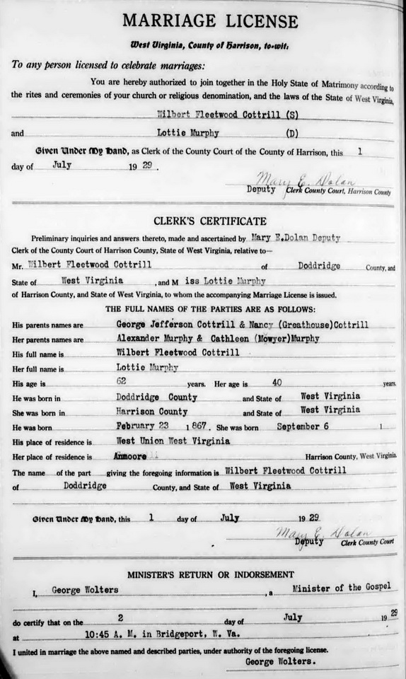 Father: Mother:Wife: Charlotte "Lottie" Murphy 1 Born: Aug- -1886 in Harrison Co, WV 2,3 Census: 1930 in Anmoore, Harrison Co, WV Resided: 1929 in Anmoore, Harrison Co, WV 3 Census: 1910 in Clark District, Harrison Co, WV Census: 1900 in Simpson District, Harrison Co, WV Father: Alexander Murphy (1855 - 1933) Mother: Catherine Moyers (1860 - 1928) Other spouse 2