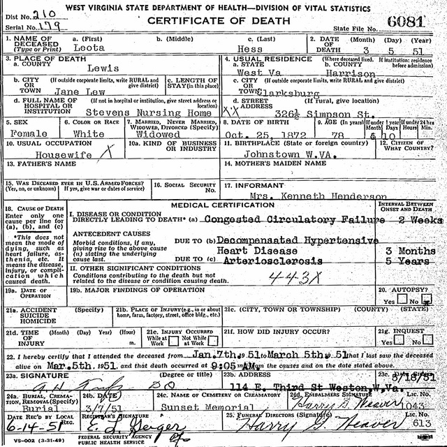 Sources: (1) Obituary of daughter. (2) WV State Dept of Health, Div of Vital Statistics, Death Certificate (http://www.wvculture.org/vrr/va_dcsearch.aspx) (3) West Virginia Deaths Index, 1853-1973 [database on-line], Ancestry.com. (4) Obituary. (5) Obituary - St. Joseph's Hospital. (6) Findagrave.com. (7) Doddridge County Republican, 2/18/1915. (8) Newspaper wedding announcement. (9) Doddridge County WV Marriages 1845-1937, Wes Cochran, 156 Gihon Meadows, Apt 150, Parkersburg, WV 26101 (Jan 1993) Event Notes Note (1) Birth date given in death record and obituary as Dec 5 1898, but date on headstone is Dec 5 1897, which would conform more to age given in marriage record. Birthplace given in marriage record as Harrison County, but death record and obituary specify Pickens, which is in Randolph County.Name Index