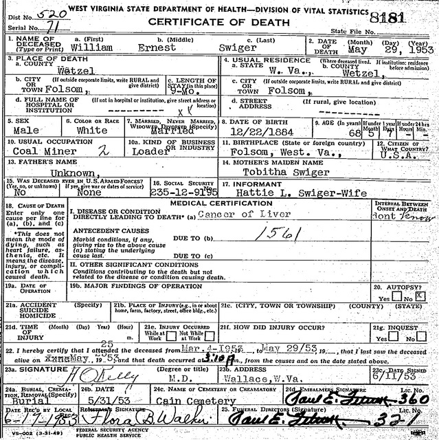 Jul-28-2018Husband: William Ernest Swiger Born: Oct-22-1884 in Folsom, Wetzel Co, WV 1,2 Died: May-29-1953 in Folsom, Wetzel Co, WV 3 Buried: in Cain Cemetery, Wetzel Co, WV 1 Cause of death: liver cancer 1 Resided: 1910 in Wetzel Co, WV 2 Occupation: loader in coal mine 1 Mother: Sarah Tabitha "Bitha" Swiger (1866 - 1944)