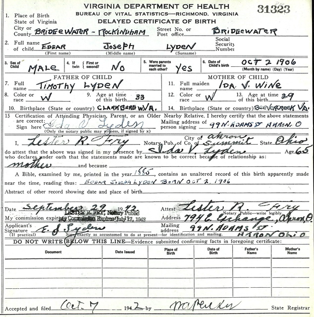 Sources: (1) Virginia Birth Records, 1864-2014 [database on-line], Ancestry.com. (2) Summit County, Ohio, Marriage Records, 1840-1980 [online database], Ancestry.com & Summit County Probate Court. (3) 1940 Census. (4) Summit County, Ohio, Marriage Records, 1840-1980 [online database], Ancestry.com & Summit County Probate Court, Identified as Edgar J. Lyden, single, 28, b. Oct 2 1905 in Spring Creek Va, son of Timothy Lyden & Ida Wine, res. 111 Good St in Akron, occupation Brinks Express; and Dorothy B. Shafrathe, single, b. May 23 1907 in Massillon Ohio, dau of William Shafrathe & Clara Snyder, res. 516 East Market St in Summit County, occupation stenographer. Married Oct 28 1933 by Rt. Rev. F. A. Schreiber of St. Bernard Church, Akron. (5) Record of husband's remarriage. (6) Florida Death Index, 1877-1998 [database on-line], Ancestry.com and Florida Dept of Health, Office of Vital Records. (7) 1930 Census.Name Index
