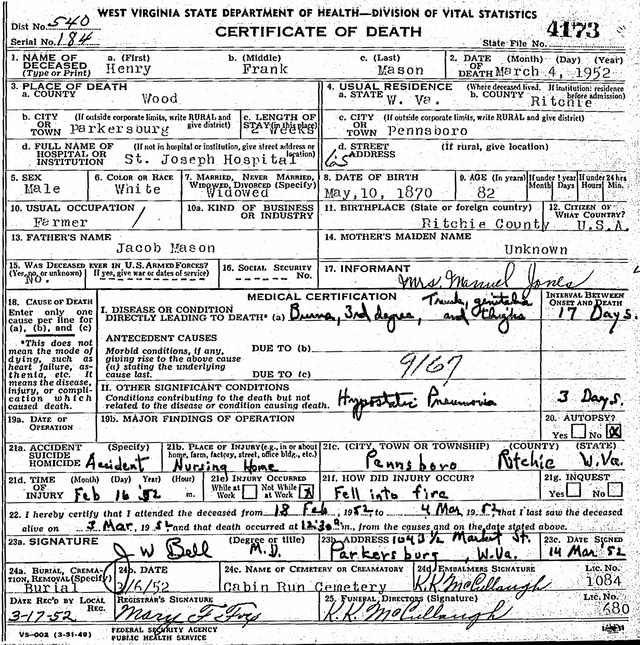 Jul-28-2018Husband: Henry Franklin "Frank" Mason Census name: Frank H. Mason Born: May-10-1870 in Clay District, Ritchie Co, WV 1,2 Died: Mar- 4-1952 in Parkersburg, Wood Co, WV 2 Buried: (unmarked) in Cabin Run Cemetery, Doddridge Co, WV 2 Cause of death: third degree burns from falling into fire at nursing home 2 Resided: in Pennsboro, Ritchie Co, WV 2 Census: 1940 in Wilbur, Tyler Co, WV Resided: 1934 in Greenwood, Doddridge Co, WV 3 Census: 1930 in Leeson Run (Greenwood), Doddridge Co, WV 4 Resided: 1929 in Pennsboro, Ritchie Co, WV 5 Census: 1900, 1910 in Central District, Doddridge Co, WV Census: 1880 in Clay District, Ritchie Co, WV Occupation: farmer 2 Father: Jacob A. Mason (1825 - 1910) Mother: Jane Wilson (1832 - 1884) Other spouse 1 Other spouse 3