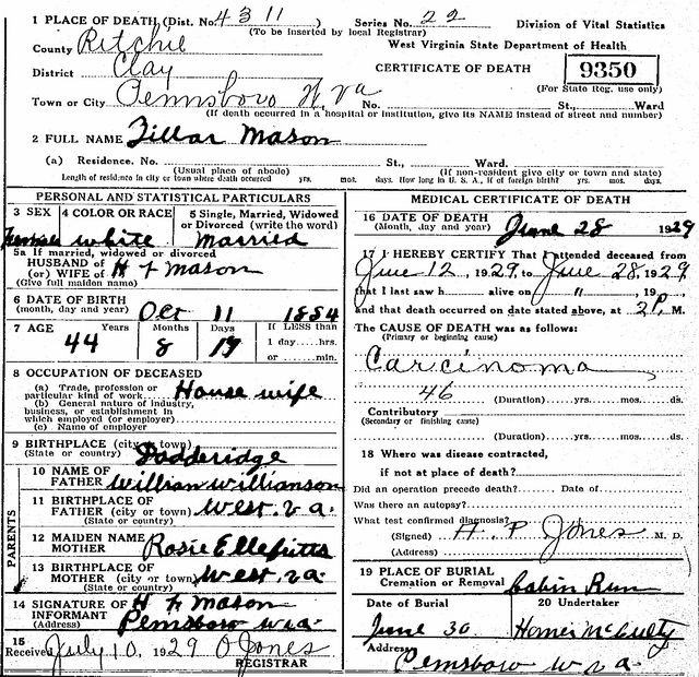 Sources: (1) West Virginia Births Index, 1853-1969 [database on-line], Ancestry.com. (2) WV State Dept of Health, Div of Vital Statistics, Death Certificate (http://www.wvculture.org/vrr/va_dcsearch.aspx), http://www.wvculture.org/vrr/va_view.aspx?Id=1327248&Type=Death. (3) Ritchie County Marriage Records, Harrisville, WV, http://www.wvculture.org/vrr/va_view.aspx?Id=11545532&Type=Marriage. (4) 1930 Census, Doddridge County, WV (Central District). (5) WV State Dept of Health, Div of Vital Statistics, Death Certificate (http://www.wvculture.org/vrr/va_dcsearch.aspx) (6) Doddridge County Marriage Records, West Union, WV, Identified as H. Frank Mason, 35, b. Ritchie Co, res. Doddridge Co; and S. Zeller Williamson, 21, b. & res. in Doddridge Co. Married Feb 24 1907 at Sunnyside, officiated by N. E. Duckworth, "a Local Preacher.", http://www.wvculture.org/vrr/va_view.aspx?Id=11794181&Type=Marriage. (7) West Virginia Deaths Index, 1853-1973 [database on-line], Ancestry.com. (8) Doddridge County WV Marriages 1845-1937, Wes Cochran, 156 Gihon Meadows, Apt 150, Parkersburg, WV 26101 (Jan 1993) (9) Findagrave.com. (10) Ohio Deaths, 1908-1932, 1938-1944, and 1958-2007 (online), Ancestry.com and Ohio Department of Health. (11) Social Security Death Index. (12) 1910 Census, Doddridge County, WV (Central District) (13) Marriage record of daughter. (14) West Virginia Marriages Index, 1785-1971 [database on-line], Ancestry.com. Event Notes Note (1) Birth date given in 1900 Census as Oct 1886, and death record gives birth date as Oct 11 1884. But her birth record shows it as Nov 11 1886. Note (2) Birth date on headstone is Apr 8 1908.Name Index